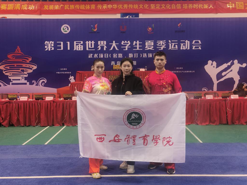 本网讯 4月1日至5日,第31届世界大学生夏季运动会武术项目选拔赛在山东青岛城阳体育馆落下帷幕。我校武术套路代表队学生唐潘、武卓文在教师罗雪琳的带领下与全国各省市的37所大学、130余名运动员同场竞技、激烈角逐,最终唐潘获得女子自选长拳项目和女子自选剑术项目两枚金牌。