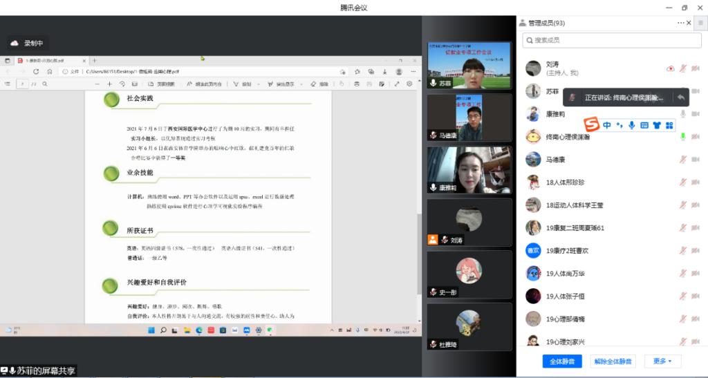 本网讯    为落实2022届全省高校毕业就业工作推进会议精神,为学生搭建就业平台,促进学院就业工作,运动与健康科学学院经过认真筹划,4月22日召开“用人单位大走访,全员联动促就业”线上就业会议。副校长陈彦、运动与健康科学学院党委书记刘勇、院长刘涛,运动创伤医院院长何昌谋,就业指导中心主任王鹏以及学院全体无课老师和2018级全体学生参加会议。会议邀请20余家实习单位代表、10余位优秀校友参加。会议由副院长刘军主持。