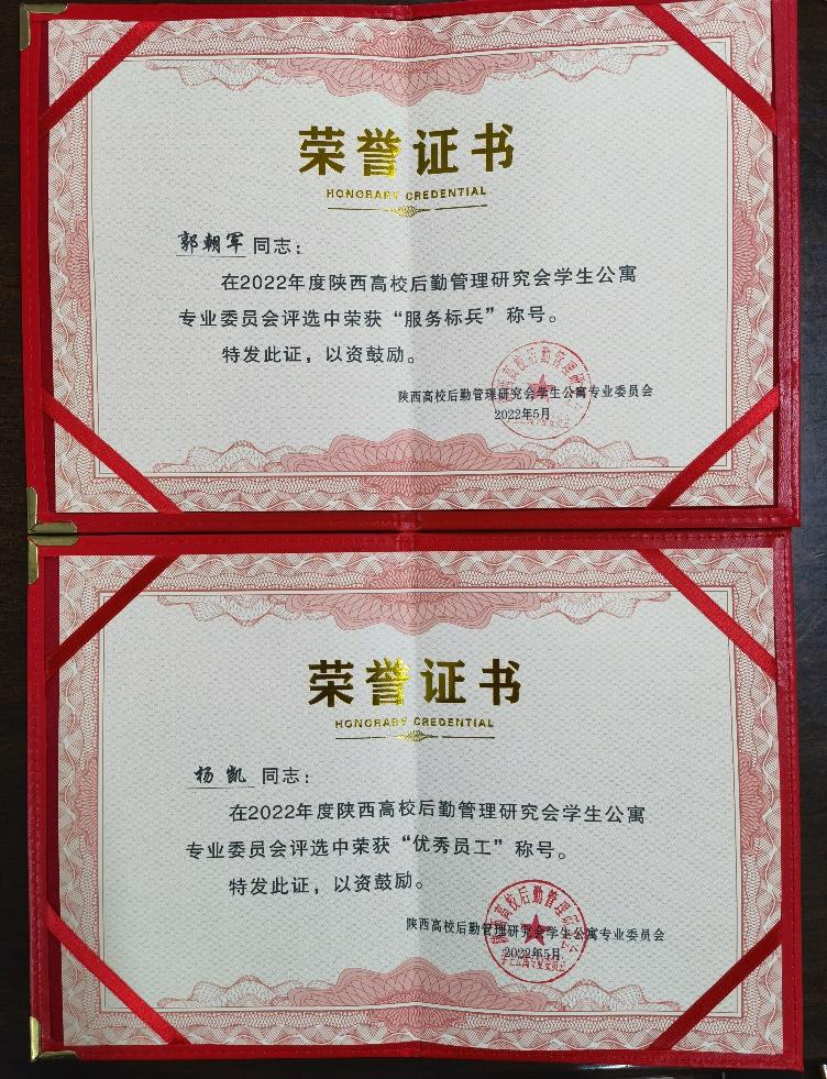 会议对2021年全省后勤各线工作进行了总结,并对表现优秀的集体和个人进行了表彰。我校后勤管理处(集团)学生公寓管理中心因各项工作组织管理到位,成绩突出,被评为陕西省后勤管理“2021年度学生公寓管理先进集体”。中心主任郭朝军被评为“2021年度学生公寓管理服务标兵”,中心副主任杨凯被评为“2021年度学生公寓管理优秀员工”。
