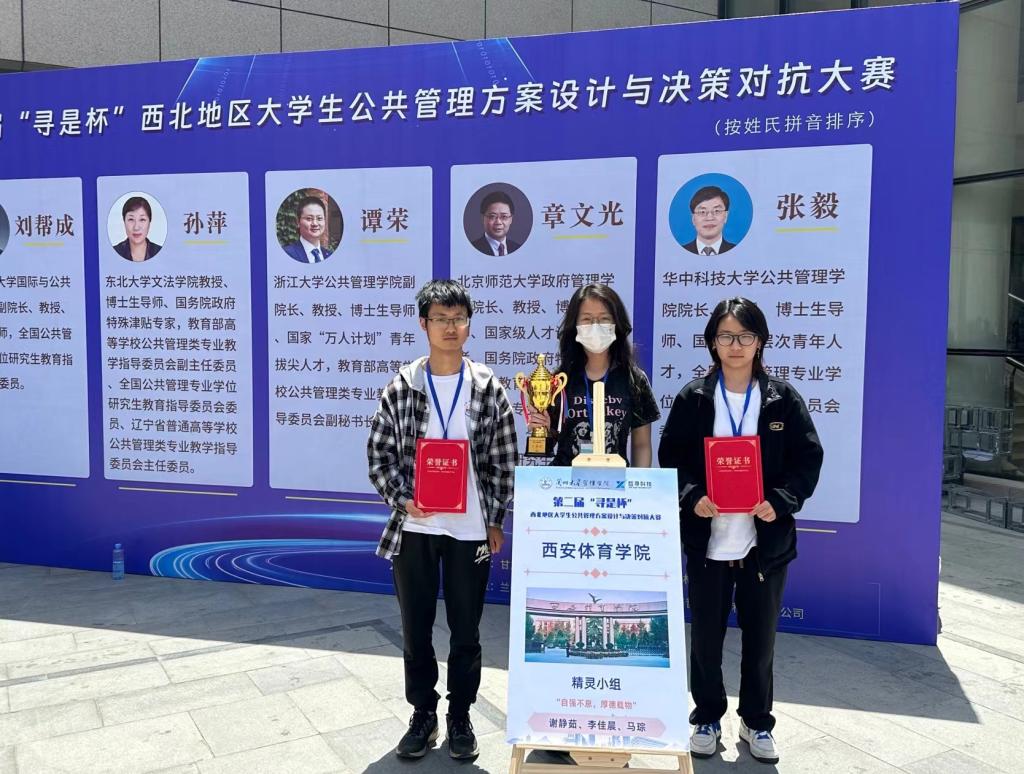 本网讯 5月27日-29日,由甘肃省管理类专业教学指导、认证与教材建设指导委员会主办、兰州大学管理学院承办的第二届“寻是杯”西北地区大学生公共管理方案设计与决策对抗大赛在兰州大学圆满举办。我校体育经济与管理学院公共事业管理专业本科学生李佳晨、谢静茹、马琮在杨涛、穆晓两位老师的指导下,从西北地区42所高校、43支参赛队伍(200余名师生)中脱颖而出,荣获二等奖。